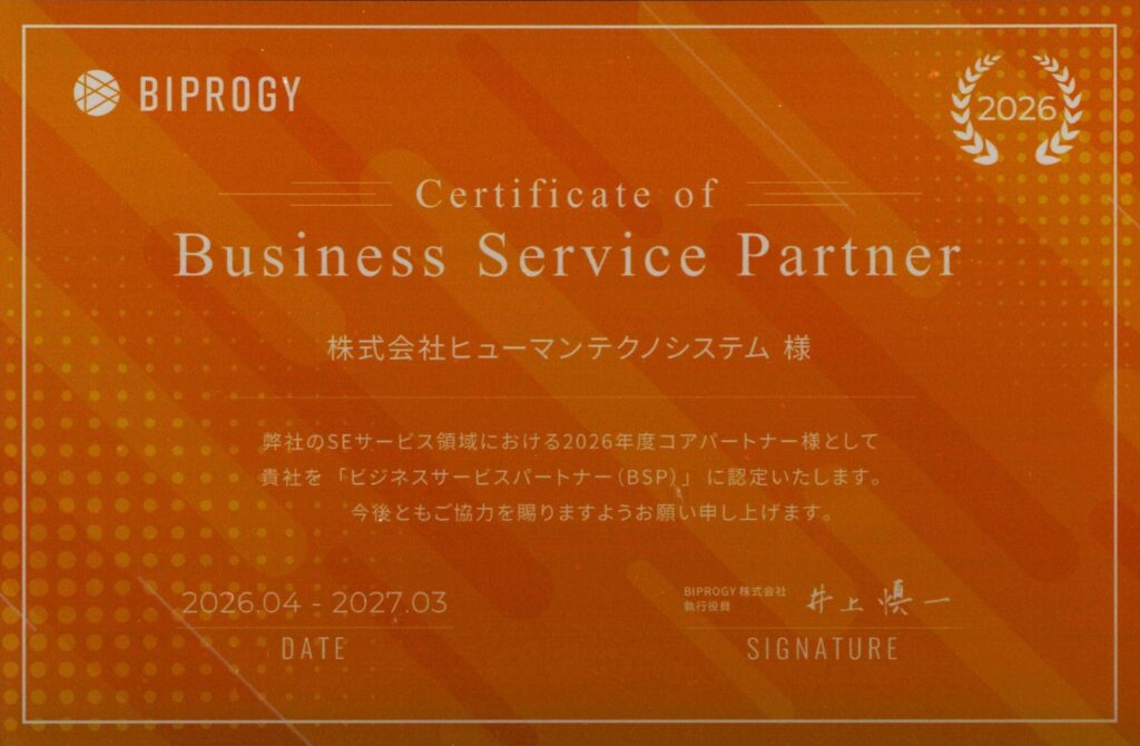 2026年度版BIPROGY株式会社 BSP認定の取得 2026年4月14日 最終更新日時 : 2026年4月14日 松村 佳代 BIPROGY株式会社さまより、「2026年度ビジネスサービスパートナー(BSP)」に認定されました。 認定期間:2026年4月~2027年3月